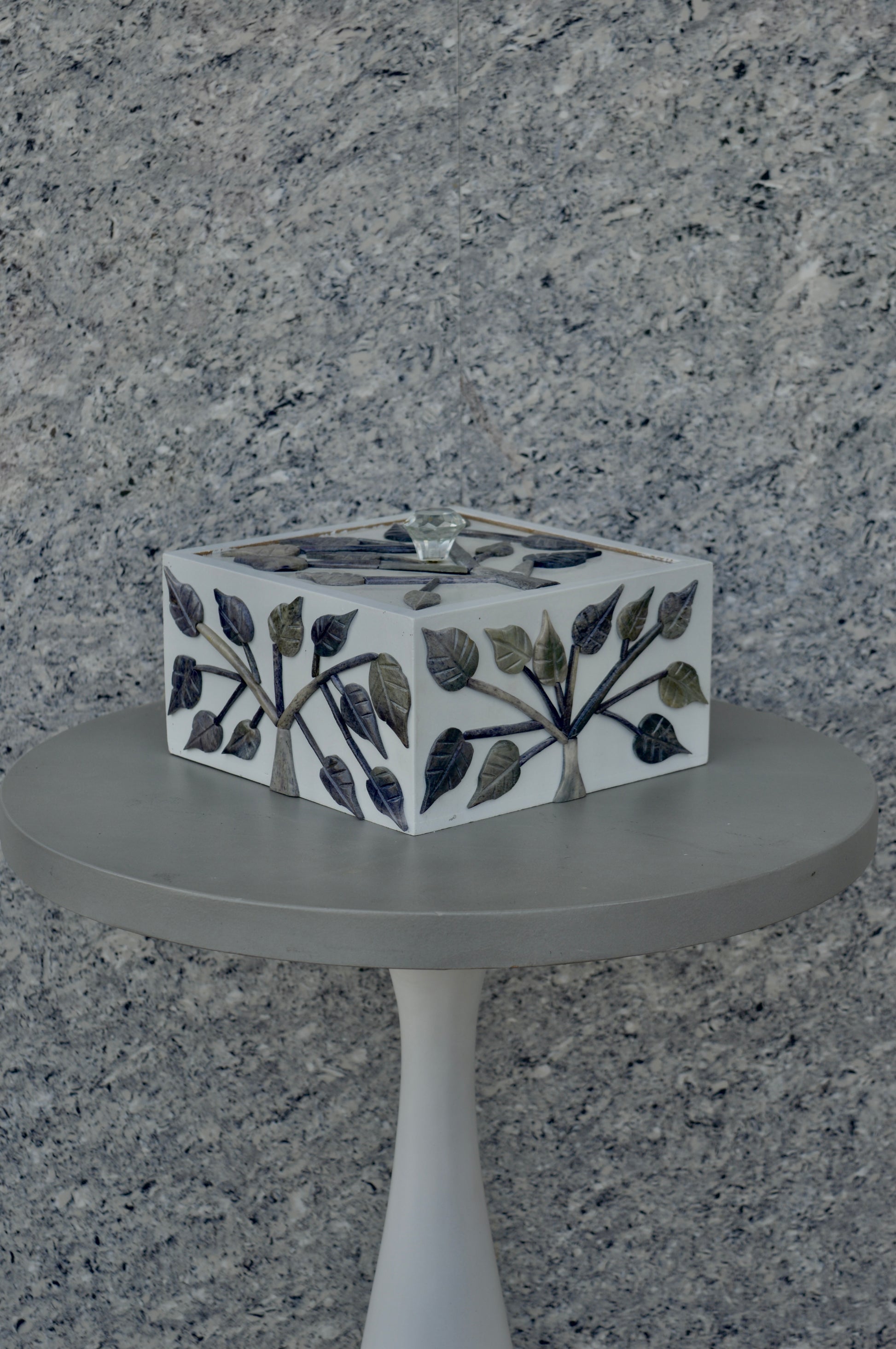 Handcrafted Leaf Inlay Cube Decorative Box with Crystal Knob – White Storage Organizer & Home Accent